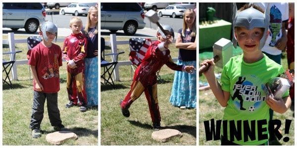 One of the hardest games was for the lesser known member of the Avengers: Hawkeye. Maybe he’s not as popular because he hasn’t had his own movie made yet, but he’s pretty good with a bow and arrow! We used a toy bow and arrow set and the kids took turns trying to shoot the arrows through the hole in an inflatable pool ring. I gave the winner of this game a really nice Avengers beach towel.