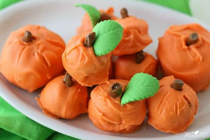 - Roll up the mixture into balls, pressing down on the top slightly to make them a little more pumpkin shaped. Place on a wax paper lined sheet pan and freeze for about 10 minutes to harden slightly.