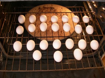 - Place a baking sheet pan in the bottom of the oven (just in case an egg breaks).