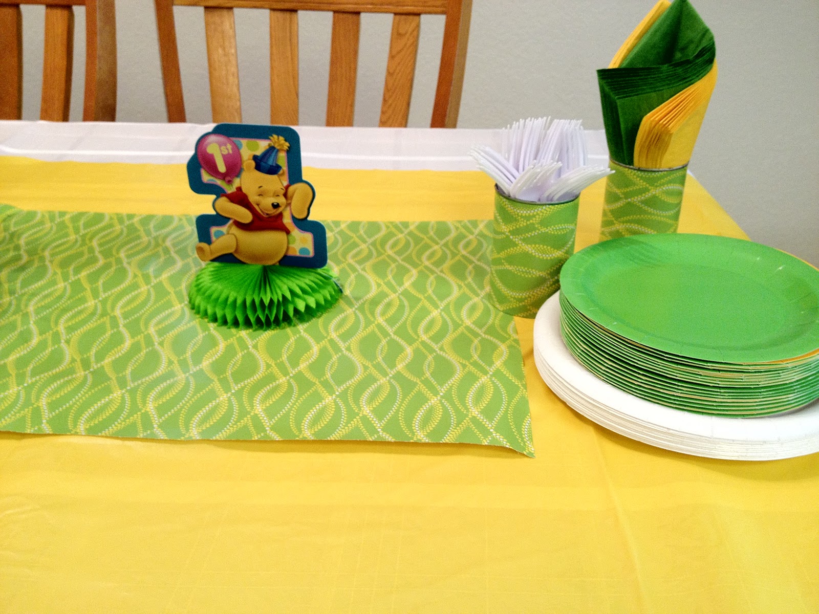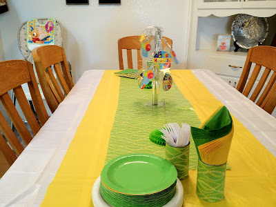 I saw this idea to use wrapping paper as a table runner a while ago, and I thought it was a great idea. I bought some paper that coordinated with my color scheme and was ready to go. What should have been as easy as unrolling it was complicated by the fact that my dollar store table cloth (I know, you get what you pay for) was about two feet wide and eight feet long. So my paper runner was wider than my table cloth! Ugh! It took a little rearranging, but I used a cloth white table cloth, used my yellow plastic one as a runner and then cut a smaller length of paper as a runner over the yellow one. It turned out pretty cute, and next time I’ll be sure to check the sizing before I buy another dollar store table cloth!