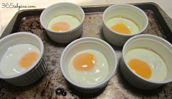 First, crack an egg into a ramekin or large muffin pan. I was obsessed with not breaking the yolks because it’s prettier. Actually, they would probably bake more evenly if you pierce the yolk after cracking the egg into the container. Bake at 350ยฐ for 12 minutes. That seems odd, but 10 minutes left them still runny and 15 was TOO much. Oh, and word of advice: DON’T forget to grease the pans first! Getting the egg out isn’t exactly the easiest that way.